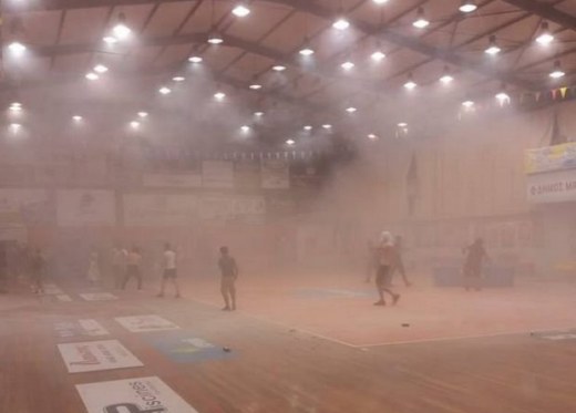 Μάλιστα όταν ένας από τους οπαδούς ενεργοποίησε έναν πυροσβεστήρα, η ατμόσφαιρα στο κλειστό του Μαρκόπουλου έγινε αποπνικτική και το παιχνίδι διεκόπη, με το σκορ στο 61-51.