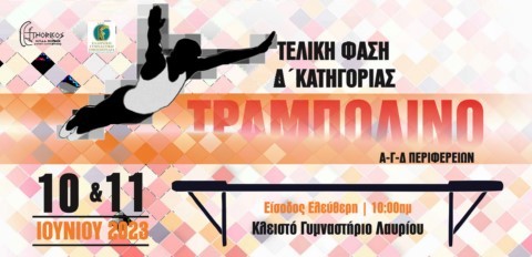 Το Ν.Π.Δ.Δ. «ΘΟΡΙΚΟΣ» του Δήμου Λαυρεωτικής σε συνεργασία με την Ελληνική Γυμναστική Ομοσπονδία διοργανώνουν την τελική φάση Τραμπολίνο, Συλλόγων και Ατομικού Δ΄ Κατηγορίας Α- Γ- Δ Περιφερειών, που θα διεξαχθεί στο κλειστό Γυμναστήριο Λαυρίου το Σάββατο 10 & την Κυριακή 11 Ιουνίου 2023 στις 10:00.